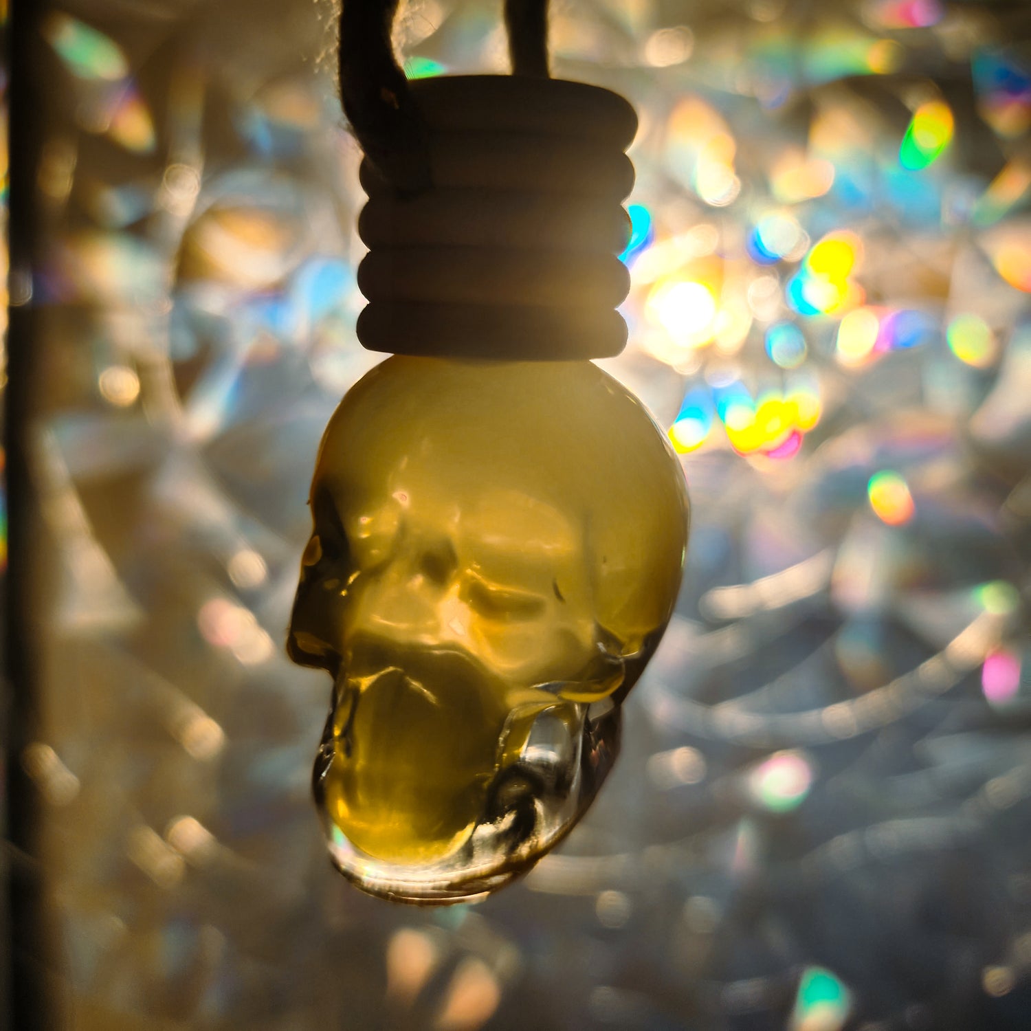 Each car air freshener is housed in a clear glass skull-shaped bottle with a natural wooden cap and matching hanging cord. We hand-fill each one with fragrance, allowing the scent to slowly wick into the wood and gently diffuse through your car as it sways from the rearview mirror. Compact and refillable, it adds a subtle gothic accent while keeping your space softly scented without being overpowering.